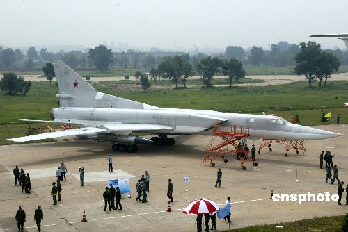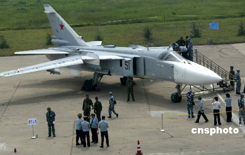 中新網(wǎng)8月26日電 26日上午,參加“和平使命-2005”中俄聯(lián)合軍事演習(xí)的俄羅斯空軍裝備在青島流亭機(jī)場(chǎng)進(jìn)行展示。中共中央政治局委員、中央軍委副主席、國(guó)務(wù)委員兼國(guó)防部長(zhǎng)曹剛川觀看展覽。
