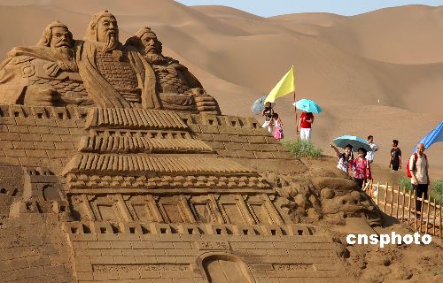 8月27日,幾名游客在欣賞沙雕作品。第二屆中國(guó)沙雕藝術(shù)節(jié)在新疆鄯善縣庫(kù)木塔格沙漠沙雕城開幕,共有12組反映新疆歷史文化、民風(fēng)民俗的沙雕作品向游人開放。作者:劉健