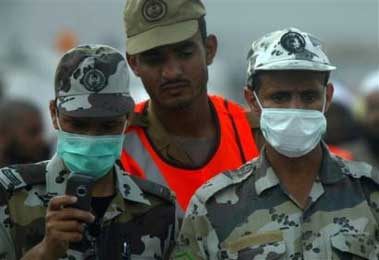 圖為沙特安全人員目視著踩踏中遇難者的尸體。(章田)