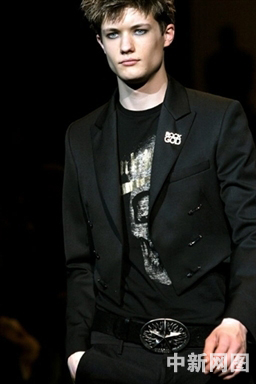 1月17日,在意大利米蘭舉行的2006/07秋冬男裝發(fā)布會上,一名模特在展示英國設(shè)計師John Richmond的作品。