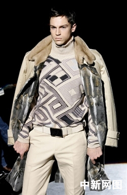 1月16日,在意大利米蘭舉行的2006/07秋冬男裝發(fā)布會(huì)上,一名模特在展示意大利設(shè)計(jì)師Gianfranco Ferre的作品。