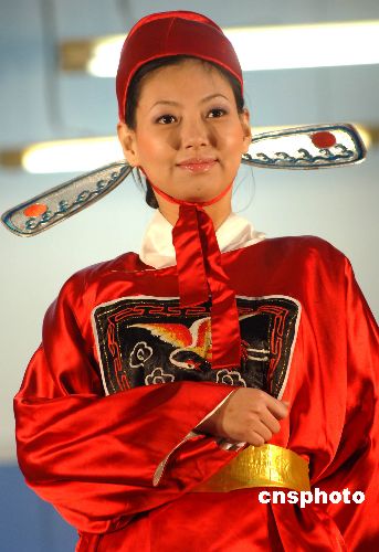 一月二十八日,北京“第二十一屆地壇春節(jié)文化廟會(huì)”中國(guó)古代時(shí)裝展上,一款具有古為今用特點(diǎn)的明代狀元裝亮相。作者:鄒憲