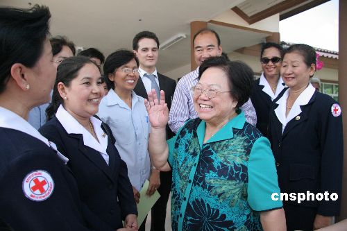 中國(guó)紅十字會(huì)會(huì)長(zhǎng)彭珮云在“中泰紅十字友誼村”