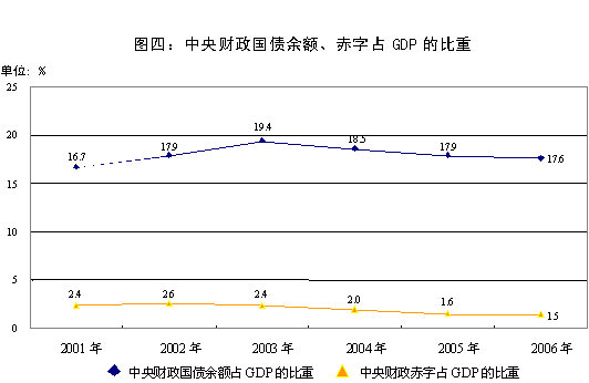 根據(jù)上述總體思路,2006年預(yù)算的主要指標(biāo)安排如下:中央財(cái)政總收入19272.04億元,比2005年增加2022.25億元,增長(zhǎng)11.7%。其中,中央本級(jí)收入18520.3億元,比2005年增加1984.36億元,增長(zhǎng)12%。中央財(cái)政總支出22222.04億元,比2005年增加1972.63億元,增長(zhǎng)9.7%。其中,中央本級(jí)支出9525億元,比2005年增加749.27億元,增長(zhǎng)8.5%;對(duì)地方稅收返還和補(bǔ)助支出12697.04億元,比2005年增加1223.36億元,增長(zhǎng)10.7%。中央財(cái)政收支相抵,赤字2950億元,比2005年預(yù)算減少50億元,財(cái)政赤字占GDP的比重預(yù)計(jì)進(jìn)一步下降到1.5%。2006年,中央財(cái)政安排國(guó)債項(xiàng)目資金600億元,比2005年減少200億元(其中取消代地方政府發(fā)行國(guó)債100億元),同時(shí)增加中央預(yù)算內(nèi)經(jīng)常性建設(shè)投資100億元。中央財(cái)政國(guó)債余額35568億元,比2005年同口徑增加2954億元。匯總中央和地方財(cái)政收支安排,2006年全國(guó)財(cái)政收入35423.38億元,增加3795.4億元,增長(zhǎng)12%;全國(guó)財(cái)政支出38373.38億元,增加4665.36億元,增長(zhǎng)13.8%。