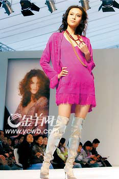幾大品牌紛紛提倡“拜金”,卻各有“金招”,其中最出位的要屬M(fèi)ARINA RINALDI。但見普通的白襯衫被釘上了金色鉚釘,休閑長(zhǎng)褲的外側(cè)爬滿金光閃閃的蝴蝶與花草,長(zhǎng)長(zhǎng)的頸巾布滿了金色閃片,針織背心的肩頭被金屬片飾加以勾勒,就連風(fēng)衣前襟都散落著大大小小的金屬閃片,令人拍案叫絕。