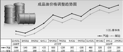 自2008年12月19日至2010年10月26日的成品油價格變化。負值為下調(diào)價格,正值為上調(diào)價格。