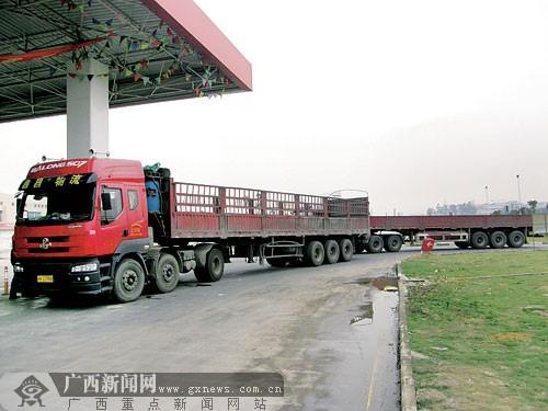 在金橋客運(yùn)站對(duì)面的一家加油站,貨車在等待加油。