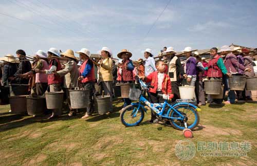 在云南楚雄州子午鎮(zhèn)法邑村3月13號(hào)打出的新井前,幾個(gè)村民陸續(xù)挑著空桶前來(lái)挑水,十幾個(gè)水桶依次并成兩排,不到10分鐘就全都裝滿(mǎn)了。