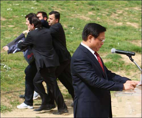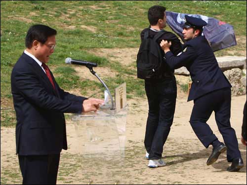 上午十一點,圣火采集儀式正式開始。陽光明媚,暖風(fēng)習(xí)習(xí),古競技場內(nèi)綠草茵茵,春花爛漫,一切都顯得生機盎然,現(xiàn)場氣氛神圣而祥和。儀式進行了十幾分鐘,北京奧組委主席劉淇上前開始發(fā)表講話,這時,記者看見來賓席上突然躥出一個人,他奔向劉淇,在劉淇身旁展開一個橫幅,另有兩個顯然是他同伙的人也加入進來發(fā)難。但他們迅即被在場的希臘警察制服,并被帶離現(xiàn)場。在這一不到兩分鐘的過程中,劉淇繼續(xù)沉穩(wěn)莊嚴(yán)地發(fā)表講話,未受到任何影響。當(dāng)劉淇主席講話結(jié)束和會場傳來北京奧運圣火在赫拉神廟前已點燃的消息時,整個現(xiàn)場響起了雷鳴般的掌聲,在場的人們用這種方式表達了對奧運的熱愛和對北京奧運會的祝福。整個儀式按既定程序進行,那場小鬧劇也成了全世界愛好和平、熱愛奧運的人們的笑柄。