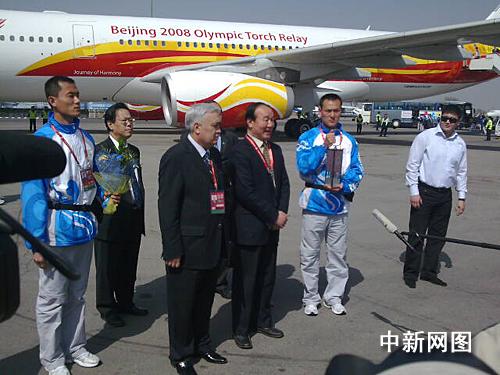 “和諧之旅”的首站之行非常順利,奧運(yùn)包機(jī)比原定時(shí)間早一些到達(dá)阿拉木圖的機(jī)場(chǎng)。當(dāng)?shù)販囟?6°C,天氣特別晴好。北京奧組委執(zhí)行副主席蔣效愚提著圣火燈走下舷梯,受到了前來(lái)迎接的阿拉木圖市和哈薩克斯坦奧委會(huì)代表,以及該市市民的熱烈歡迎。在展示圣火燈后,蔣效愚將其交給隨行的兩位圣火護(hù)衛(wèi)隊(duì)員。隨后,蔣效愚接受了當(dāng)?shù)孛襟w采訪,表示很高興圣火來(lái)到阿拉木圖,希望能夠促進(jìn)兩國(guó)的友好關(guān)系。