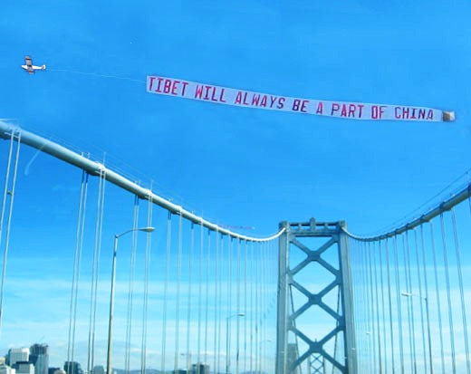 華人華僑還為這次傳遞活動(dòng)租用了兩架直升飛機(jī),盤旋在沿途的上空。一架飛機(jī)上用英文拉出橫幅,“TIBET WILL AIWAYS BE A PART OF CHINA(西藏永遠(yuǎn)是中國(guó)的一部分)”,另外一個(gè)橫幅是:“GO BEIJING CHINA!GO OLYMPICS。g迎到北京看奧運(yùn)會(huì))”。