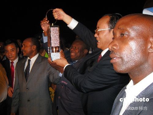 這是自一九三六年奧運(yùn)圣火有了傳遞活動(dòng)之后,首次抵達(dá)東非地區(qū)。北京市副市長(zhǎng)、北京奧組委執(zhí)行副主席劉敬民手持圣火燈走下飛機(jī),達(dá)累斯薩拉姆市市長(zhǎng)亞當(dāng)·金比薩、坦桑尼亞新聞、文化與體育部部長(zhǎng)喬治·姆庫(kù)奇卡以及坦桑尼亞奧委會(huì)秘書(shū)長(zhǎng)巴伊親赴機(jī)場(chǎng)迎接。