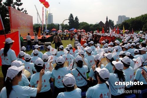 5月15日上午,“迎奧運(yùn)、頌海西”為四川災(zāi)區(qū)賑災(zāi)義演在福州左海公園舉行,一千多名福建省各部門(mén)離退休老干部組成合唱團(tuán)參加義演。 中新社發(fā) 鄭祚聲 攝