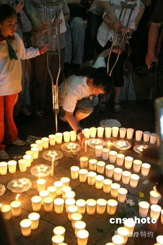 2008年5月21日,全國(guó)哀悼日的第三天,上海市政府對(duì)面的人民廣場(chǎng)上擠滿了對(duì)汶川地震遇難同胞哀悼的人群。在人群中有一位拄著拐杖的女孩,她便是奧運(yùn)火炬手金晶,在周?chē)巳旱臄v扶下,她艱難的彎下腰點(diǎn)燃蠟燭并向汶川地震遇難同胞默哀。 中新社發(fā) 俊影 攝