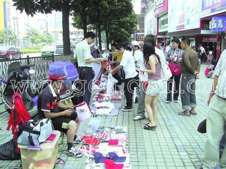 “奧運主題T恤15元一件,紅旗4元一對,紅色‘中國心’貼紙2元一版……”近幾日,記者在貴陽市大十字、紫林庵、噴水池、師大等主要路段看到,有不少商家在路邊擺起了地攤,奧運小商品有T恤、印有“中國加油”的絲帶、黃色五角星的掛飾、小的五星紅旗等,吸引了不少市民駐足購買。一位頭上扎著紅色絲帶,臉上貼著心形臉貼,手中揮舞著小國旗的河南商人告訴記者,“最近幾天生意都不錯,每天都能賣出100多件商品,其中小國旗是最好賣的!币晃徽谔暨x福娃T恤的韓先生對記者說,他前天已經(jīng)為他們一家3口買了3對國旗,想到奧運圣火馬上要來貴陽了,再來買3件“奧運T恤”,這樣主要是表達自己對北京奧運會的支持和期盼。