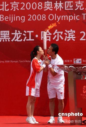 7月11日,北京奧運(yùn)火炬在“冰城”哈爾濱傳遞,火炬手著名花樣滑冰世界冠軍、“冰上情侶”申雪、趙宏博,在點燃圣火盆前共同深情地親吻“祥云”火炬。中新社發(fā) 周兆軍 攝