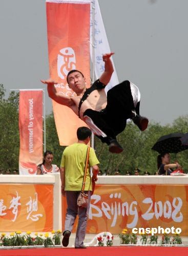 7月11日,北京奧運(yùn)火炬在哈爾濱傳遞,當(dāng)?shù)匚湫g(shù)運(yùn)動員在傳遞結(jié)束儀式上激情獻(xiàn)藝。 中新社發(fā) 周兆軍 攝