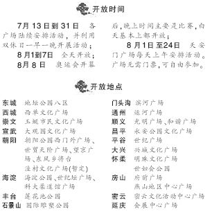 據(jù)了解,26個奧運文化廣場包括地壇公園、西單文化廣場等,覆蓋18個區(qū)縣。內(nèi)容包括大屏幕轉(zhuǎn)播、文藝演出、文化展示、展覽等7個奧運元素。7月13日到31日,各廣場陸續(xù)安排活動;8月1到7日,全天開放;8月8日奧運會開幕后,晚上時間主要是比賽,白天基本上都開放;從8月1日至24日,天安門廣場每天上午安排活動。文化廣場無需任何門票,市民自由參加。