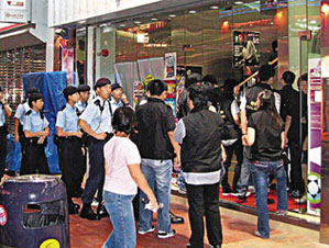 香港警方12日晚展開“雷霆08”反罪惡行動,拘120人。圖為探員于元朗教育路的一間卡拉OK巡查。(圖片來源:文匯報)