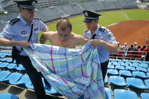 當日,在“比賽”中,紅藍兩個球隊的數(shù)十名球迷因觀賽突發(fā)“騷亂”,互相謾罵推搡,兩名志愿者立即打出“您的行為已違反《觀賽規(guī)則》,請立即停止”的藍色警告牌,但雙方情緒激動,有人扭打成一團。豐臺公安分局民警迅速到場,將兩名打架男子帶下看臺。擁擠中,一名女子受傷,被場內(nèi)急救人員扶出賽場救治。突然,一個“球迷”脫下上衣狂奔,被民警火速攔下,裹上被單帶走,賽場秩序恢復(fù)正常。