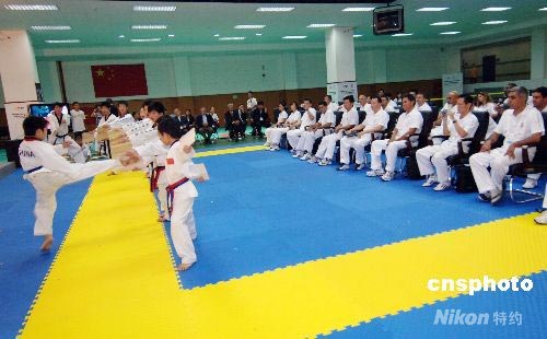 7月14日,29名將執(zhí)法北京奧運(yùn)會的裁判員聚集在北京什剎海體校跆拳道訓(xùn)練館,參加由世界跆拳道聯(lián)盟組織的奧運(yùn)前的“最后一課”。這也是世跆聯(lián)第一次在東道主國家舉辦奧運(yùn)前最后一次裁判培訓(xùn)班。圖為裁判員觀看什剎海體校跆拳道運(yùn)動員表演。 中新社發(fā) 王東明 攝