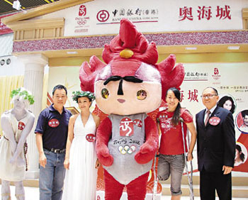殘疾擊劍運(yùn)動(dòng)員金晶(右二)14日抵港,參加在奧海城舉辦的“跳躍體壇夢(mèng)想”奧運(yùn)主題活動(dòng),與主辦單位負(fù)責(zé)人及福娃合影。(圖片來(lái)源:文匯報(bào))