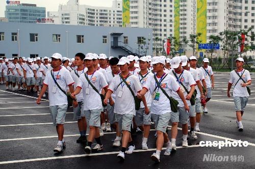 7月15日早上,駐京海軍某部300名官兵身著統(tǒng)一服裝到鳥巢參加奧運開幕式彩排。據(jù)了解,北京奧組委采取嚴(yán)格的保密措施防止開幕式節(jié)目內(nèi)容泄露,為此“鳥巢”外圍戒備森嚴(yán),共有三層隔離護(hù)欄,由公安、武警把守!傍B巢”上空的制高點也被全面封鎖,防止高空偷拍。 中新社發(fā) 楊慧峰 攝