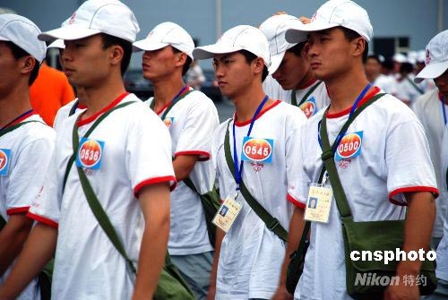 7月15日早上,駐京海軍某部300名官兵身著統(tǒng)一服裝到鳥巢參加奧運(yùn)開幕式彩排。 中新社發(fā) 楊慧峰 攝