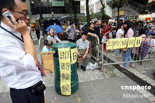 中銀香港發(fā)行奧運(yùn)紀(jì)念鈔掀起全城狂熱。連日來數(shù)千計(jì)市民冒“黃色暴雨”排隊(duì)輪候,發(fā)售奧運(yùn)紀(jì)念鈔票的各分行滿是擁擠的人龍。七月十五日下午,中銀香港尖沙咀分行向通宵排隊(duì)的市民作登記。 中新社發(fā) 洪少葵 攝