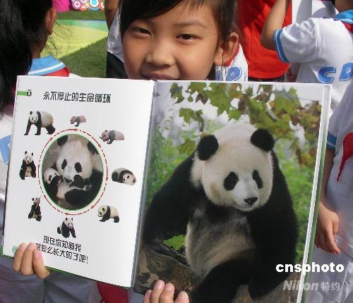 7月16日上午,全球首本由奧運大熊貓“晶晶”擔(dān)任主角的科普圖書——《我是晶晶-熊貓成長寫真》中文版在成都大熊貓繁育研究基地舉行了全球首發(fā)儀式。該書歷時兩年策劃、設(shè)計,由企鵝集團(tuán)著名的多林金德斯利公司著,童趣出版有限公司編譯,人民郵電出版社出版發(fā)行。為表達(dá)對震后四川、成都的關(guān)愛,該書的全球首發(fā)儀式安排在成都舉行。中新社發(fā) 楊杰 攝