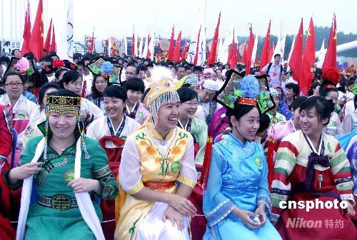7月17日,北京奧運(yùn)火炬在沈陽(yáng)傳遞,當(dāng)?shù)厣贁?shù)民族群眾喜迎奧運(yùn)火炬。中新社發(fā) 周兆軍 攝