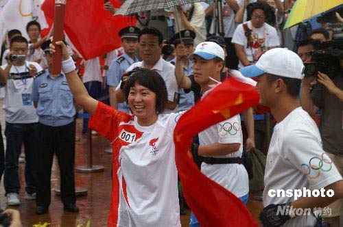 7月19日上午8時(shí),北京奧運(yùn)火炬在大連傳遞,傳遞路線從大連經(jīng)濟(jì)技術(shù)開(kāi)發(fā)區(qū)發(fā)現(xiàn)王國(guó)主題公園開(kāi)始,到經(jīng)濟(jì)技術(shù)開(kāi)發(fā)區(qū)中華武館結(jié)束,全長(zhǎng)9.41公里。大連市共有火炬手208名,圖為中國(guó)第一個(gè)歐文斯獎(jiǎng)獲得者、奧運(yùn)冠軍王軍霞傳遞第一棒火炬。 中新社發(fā) 宋太盛 攝