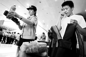 昨天10時(shí)許,記者先來(lái)到北京西站進(jìn)站口,比以往更加嚴(yán)格的是,這里除了對(duì)每件行李進(jìn)行機(jī)檢外,民警還輔助用手持液體查危儀對(duì)行李中的液體進(jìn)行檢查,現(xiàn)場(chǎng)鐵警告訴記者:“如果發(fā)現(xiàn)行李中攜帶了液體,我們將會(huì)要求旅客將液體拿出,并用儀器進(jìn)一步檢測(cè)液體安全!甭每褪掷锬弥钠垦b水,開(kāi)蓋的則要求當(dāng)場(chǎng)喝一口,沒(méi)有開(kāi)蓋的則也要過(guò)液體安檢儀。