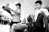 昨天10時(shí)許,記者先來到北京西站進(jìn)站口,比以往更加嚴(yán)格的是,這里除了對每件行李進(jìn)行機(jī)檢外,民警還輔助用手持液體查危儀對行李中的液體進(jìn)行檢查,現(xiàn)場鐵警告訴記者:“如果發(fā)現(xiàn)行李中攜帶了液體,我們將會要求旅客將液體拿出,并用儀器進(jìn)一步檢測液體安全!甭每褪掷锬弥钠垦b水,開蓋的則要求當(dāng)場喝一口,沒有開蓋的則也要過液體安檢儀。