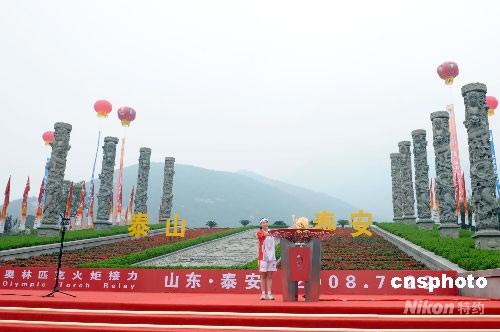 7月22日中午12點(diǎn)42,隨著末棒火炬手畢文靜在泰安天地廣場(chǎng)點(diǎn)燃圣火盆,奧運(yùn)火炬在泰安的傳遞結(jié)束。泰安是世界聞名的旅游之都,蜚聲中外的五岳之首、有國(guó)山之稱(chēng)的泰山坐落于此。中新社發(fā) 廖攀 攝
