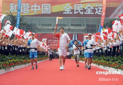 7月23日,奧運火炬在山東濟南傳遞,男籃國家隊前主力運動員鞏曉彬傳遞濟南首棒奧運火炬。濟南將在明年舉辦第11屆“全運會”。 中新社發(fā) 廖攀 攝