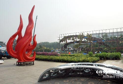 7月23日上午,天安門廣場一個火炬造型的裝飾景觀,紅色造型的火炬引人矚目。天安門廣場迎奧運盛會為主題的大型花壇即將完工。中新社發(fā) 張雙雙 攝