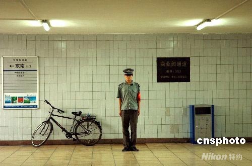 7月22日,一名保安人員在北京的地下通道內(nèi)執(zhí)勤,努力做好奧運(yùn)會(huì)期間的安全工作,確保奧運(yùn)會(huì)的順利進(jìn)行。中新社發(fā) 張雙雙 攝