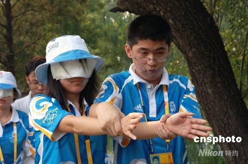 7月23日,北京2008奧林匹克青年營里的志愿者正在進(jìn)行信任度培訓(xùn)。該培訓(xùn)由兩個人進(jìn)行配合,一個人把眼睛蒙住、一個人把嘴巴封住,完全靠對方的身體語言進(jìn)行溝通,該培訓(xùn)將有助于志愿者對奧林匹克青年營里首次招募的殘疾人營員進(jìn)行幫助。 中新社發(fā) 王東明 攝