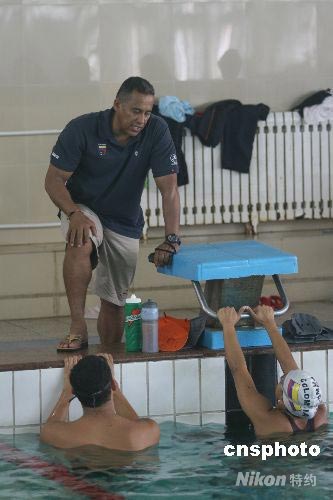 7月24日,參加北京奧運(yùn)會(huì)的哥倫比亞游泳運(yùn)動(dòng)員在教練的指導(dǎo)下進(jìn)行熱身訓(xùn)練。據(jù)悉,哥倫比亞共有5名游泳運(yùn)動(dòng)員和3名跳水運(yùn)動(dòng)員取得北京奧運(yùn)會(huì)參賽資格。這些運(yùn)動(dòng)員將陸續(xù)從美國(guó)、加拿大趕赴天津,進(jìn)行為期10天的集訓(xùn)。 中新社發(fā) 郭曉帆 攝