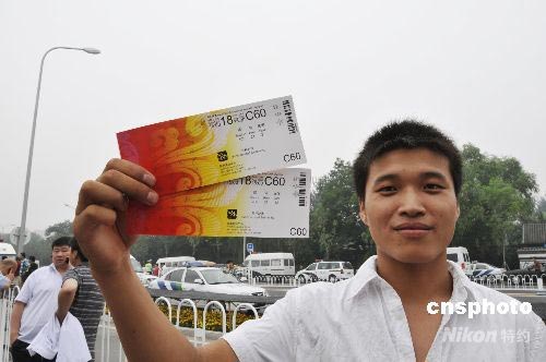 7月25日,第4階段最后82萬(wàn)張北京奧運(yùn)會(huì)比賽門票向公眾發(fā)售,銷售異常火爆。早上7點(diǎn),銷售現(xiàn)場(chǎng)除了近2萬(wàn)人在守侯排隊(duì)外,在排隊(duì)區(qū)域外,也有近萬(wàn)人正在焦急等候進(jìn)入排隊(duì)區(qū)。圖為一位來(lái)自河南的張先生向記者展示剛買到的兩張奧運(yùn)門票。張先生說(shuō),他特地從河南趕過(guò)來(lái),等了24個(gè)小時(shí)才買到票。中新社發(fā) 王宇婷 攝
