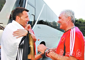 剛剛從比利時刺探完軍情返回國內(nèi)的杜伊前晚也已趕到長春和國奧大部隊會合。作為東道主,杜伊和另兩名塞籍助理教練托米奇、米西奇一早就在酒店的大堂等待同胞的抵達(dá)。當(dāng)塞隊大巴駛抵酒店門外,杜伊三人親切地迎了上去,和塞隊的官員、教練和球員逐一握手歡迎。