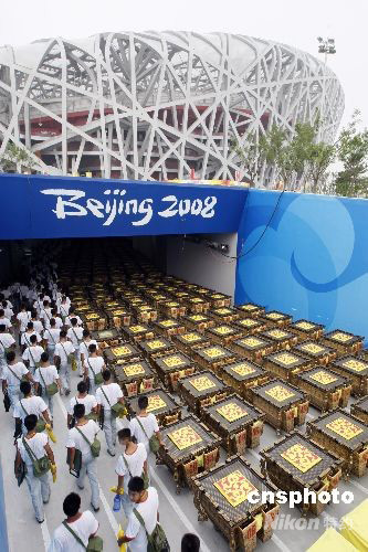 7月30日,第29屆夏季奧運會開幕式在北京國家體育場“鳥巢”進行封閉式彩排,參演人員和道具陸續(xù)入場。 中新社發(fā) 杜洋 攝