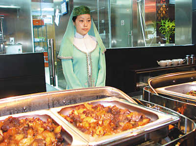 納賽爾剛剛走進(jìn)又一順飯莊,目光就被身著淡綠色伊斯蘭裝的服務(wù)員所吸引!八齻兊囊路秲浩痢!睘橘e客遞送餐具的時(shí)候,服務(wù)員楊晴的臉上一直掛著甜甜的微笑!拔覀兌Y拜帽上的紗巾,在阿拉伯國家是婦女蒙面用的,這樣的設(shè)計(jì)更加貼近了他們的風(fēng)俗!