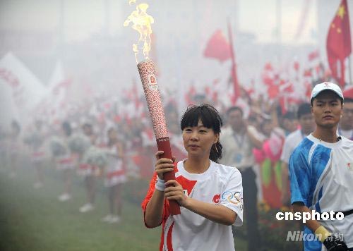 7月31日8點10分,曾獲得30個全國冠軍、51個世界冠軍、第25屆巴塞羅那奧運會女子100米蝶泳冠軍錢紅高舉“祥云”火炬在唐山體育中心主田徑場起跑,北京奧運火炬接力河北省傳遞活動的最后一站——唐山火炬?zhèn)鬟f活動正式開始。中新社發(fā) 廖攀 攝