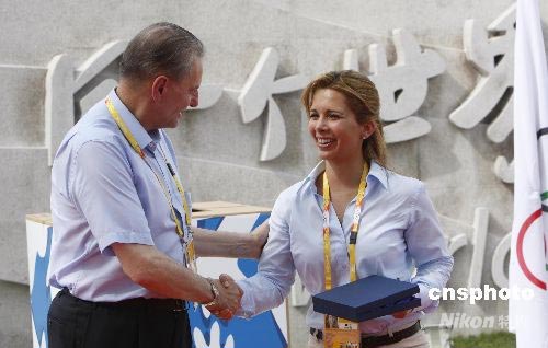 8月1日,北京奧運(yùn)村啟用的“和平友誼墻”前,“給予就是獲得”公益活動(dòng)正式啟動(dòng)。國(guó)際奧委會(huì)主席羅格向阿拉伯聯(lián)合酋長(zhǎng)國(guó)副總統(tǒng)兼總理、迪拜酋長(zhǎng)穆罕默德夫人哈雅公主頒發(fā)感謝牌。中新社發(fā) 杜洋 攝