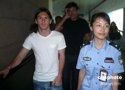 八月一日,阿根廷足球明星梅西(左),搭乘法航一一六次航班飛抵上海,在安保人員陪同下走出候機樓,與先期抵達的阿根廷國奧隊匯合,備戰(zhàn)將于八月七日開始的北京奧運會足球上海賽區(qū)比賽。 中新社發(fā) 劉友平 攝