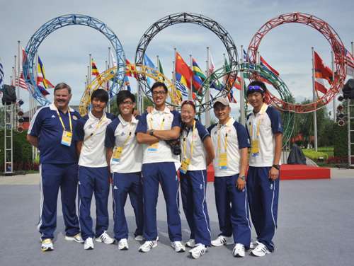 圖:香港單車隊與賽艇隊成員在奧運(yùn)五環(huán)前合照(大公報攝)