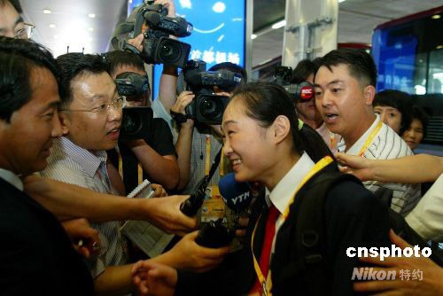 曾摘得2007年德國斯圖加特體操世錦賽女子跳馬銀牌的朝鮮體操名將洪淑貞(中),隨朝鮮奧運(yùn)代表團(tuán)一起抵達(dá)北京備戰(zhàn)奧運(yùn)會。