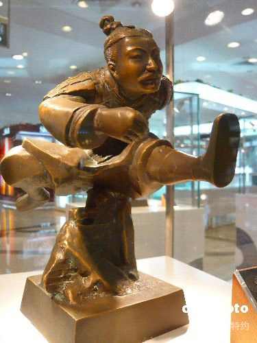 2008年8月2日,在北京一商城內(nèi),一套具有中國(guó)特色的名為“尚勇”的兵馬俑運(yùn)動(dòng)雕塑套裝和市民見面,該禮品是專門為迎接北京奧運(yùn)開發(fā)的中國(guó)特色禮品。該款雕塑將籃球、足球、體操、跨欄、棒球五種現(xiàn)代奧運(yùn)項(xiàng)目與秦兵馬俑相結(jié)合,賦予古老藝術(shù)元素以新的生命。雕塑保留了兵馬俑外披鎧甲、翹首仰頸、氣宇軒昂等待出征的氣勢(shì)。雕塑主體與底座連為一體,使用青銅鑄造完成。 中新社發(fā) 樊甲山 攝
